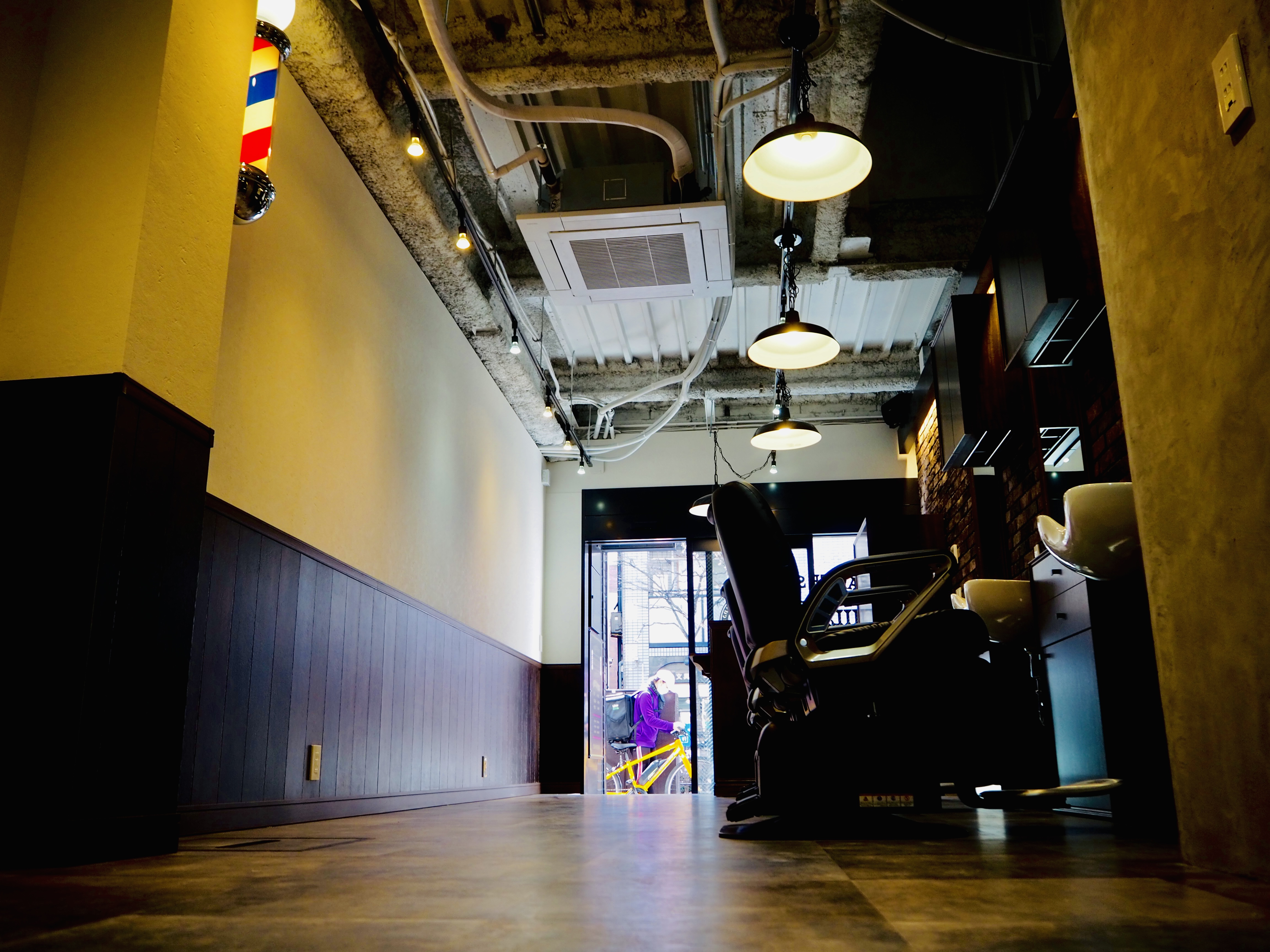 暗めな店内にサインポールが雰囲気を演出します。