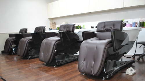 シャンプーブースはサイドシャンプーシステムからバック、サイド両方できる弊社オリジナルシャンプーユニットを新設する為床上げをし、あえて別空間へ誘導するように致しました。