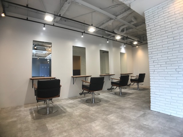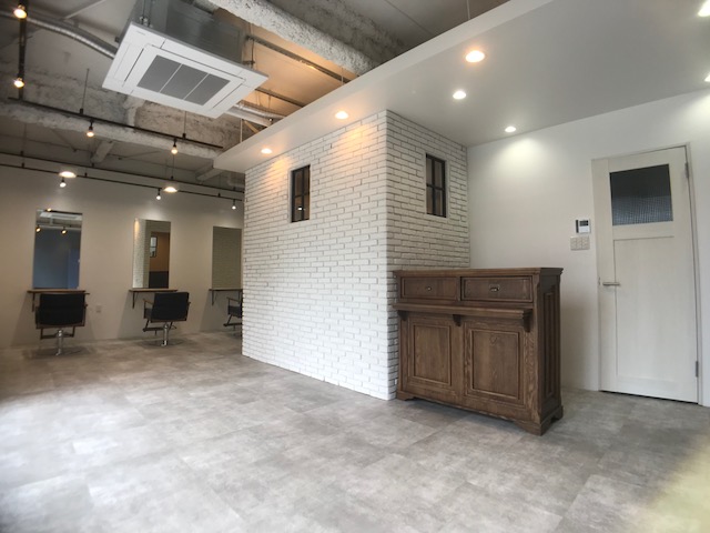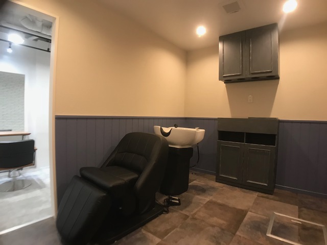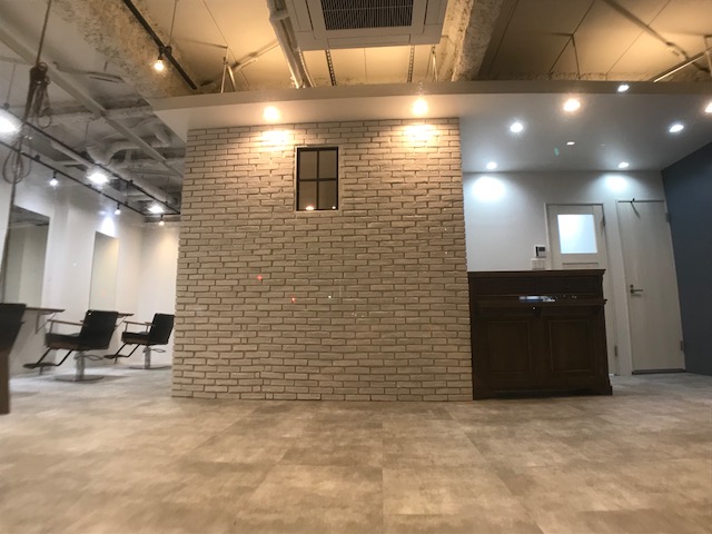 入り口を入ってからもすぐ分かるように シャンプーブースは建物の内部にいながら別な建物があるかのように 天井をせり出し、ひとつひとつ形の違うレンガタイルを壁に張り合わせ 別空間を演出しました。 オーナーからの要望から当社でデザインを選定し 提案として、素材・色合いのサンプル提出、雰囲気を想像させるCGの 提出を行いながら進めていきました。 是非、お立ち寄りの際は内部のデザインも楽しみながらお過ごしくださいませ。