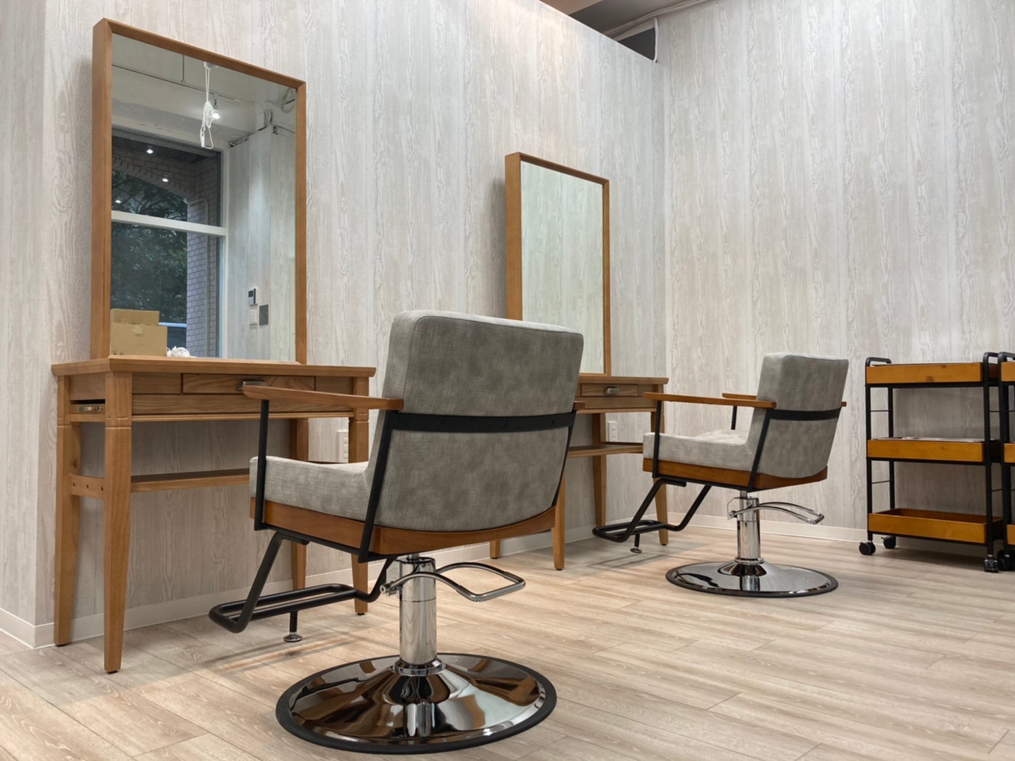ミラーやセット椅子には少し濃い目の木目を使い